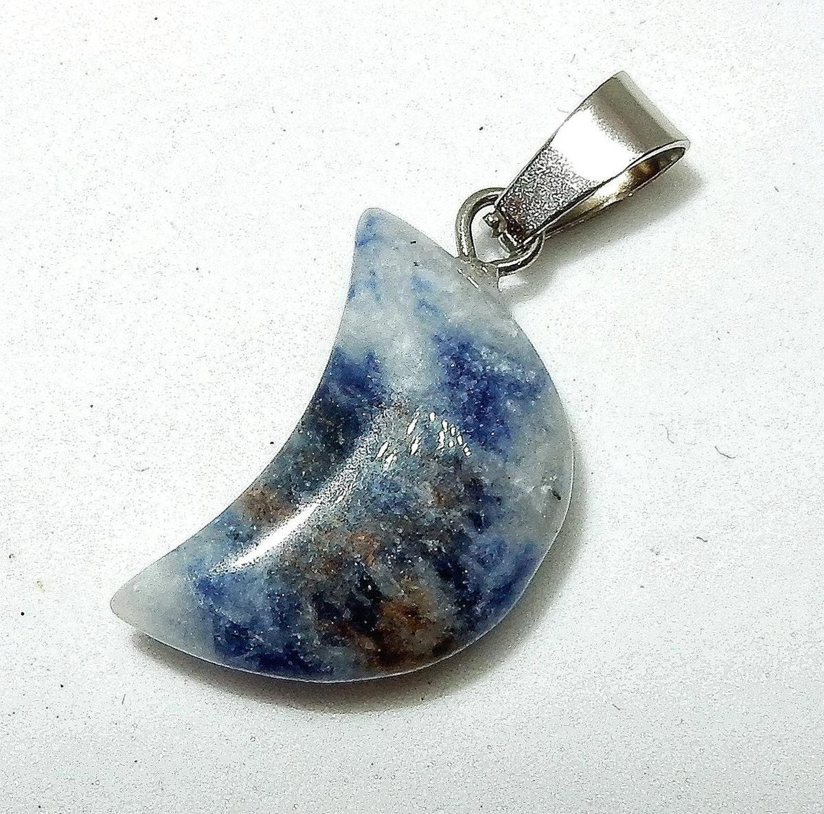 Verfijnd hangertje van een halve maan. Uitgevoerd in natuurlijke Sodaliet, compleet met een kettinkje om direct te kunnen dragen. Afmeting: 10 x 17 x 5 mm. Gewicht: 1,7 gram