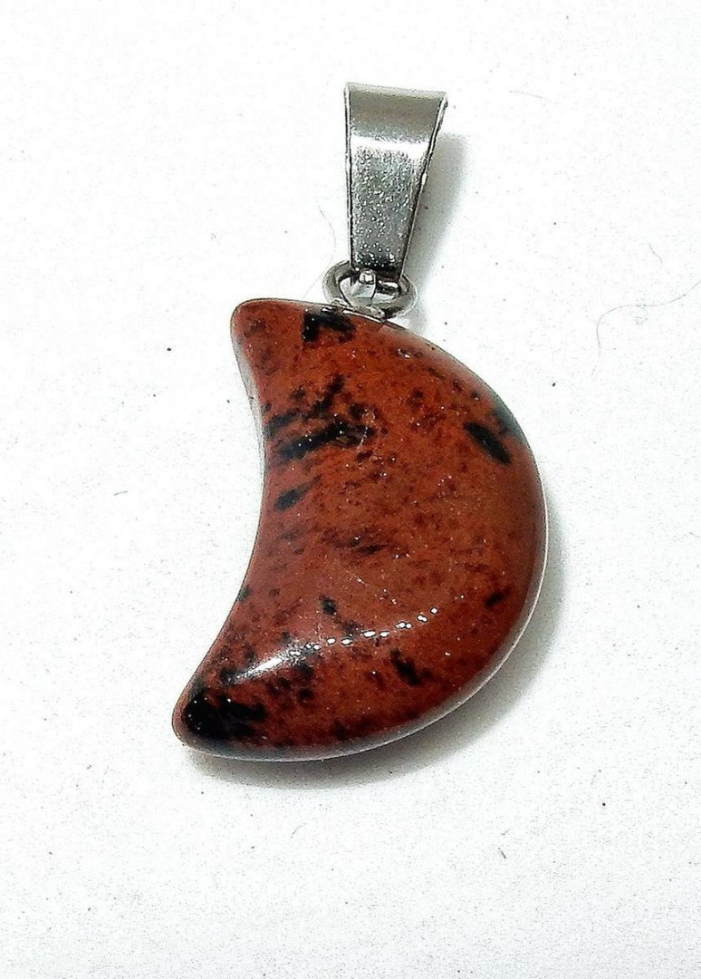 Verfijnd hangertje van een halve maan. Uitgevoerd in natuurlijke Jaspis Mahonie, compleet met een kettinkje om direct te kunnen dragen. Afmeting: 10 x 17 x 5 mm. Gewicht: 1,7 gram