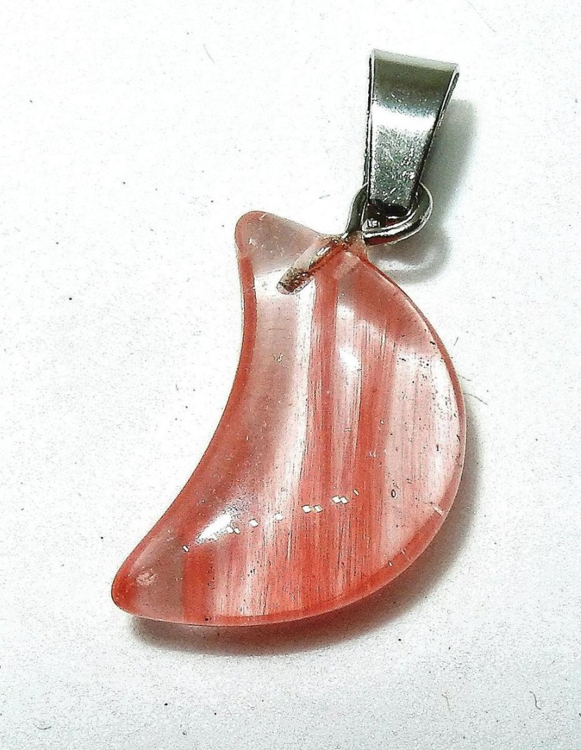 Verfijnd hangertje van een halve maan. Uitgevoerd in natuurlijke Rozenkwarts, compleet met een koordje om direct te kunnen dragen. Afmeting: 10 x 17 x 5 mm. Gewicht: 1,7 gram