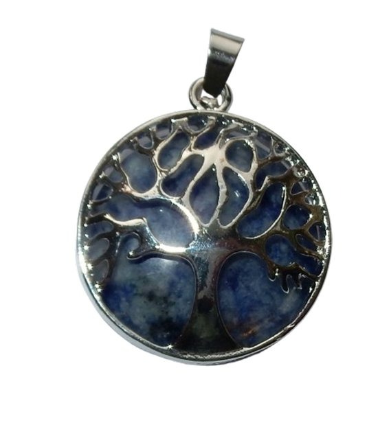 Prachtig vormgegeven hanger van een ronde plaat natuurlijke Sodaliet, gevangen in een zilverkleurig raam en verfraaid met een verzilverde levensboom.