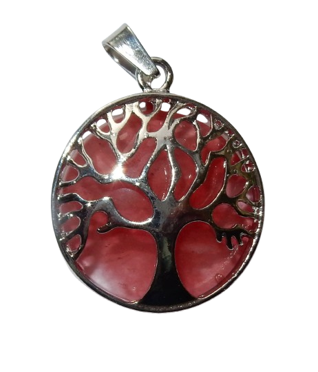 Prachtig vormgegeven hanger van een ronde plaat natuurlijke Kwarts, gevangen in een zilverkleurig raam en verfraaid met een verzilverde levensboom.